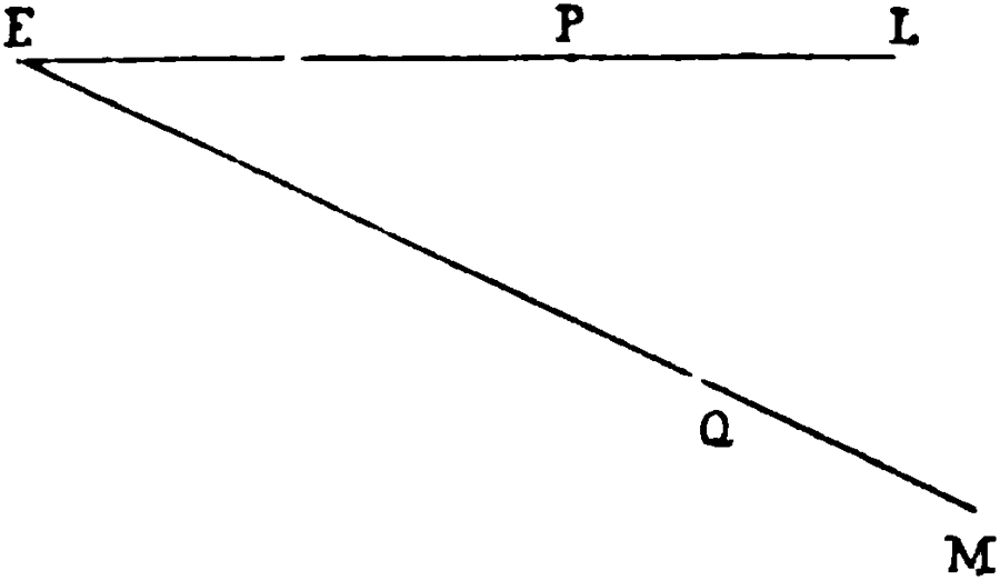 Nothing could be simpler than the principle of the [15]method proposed. The horizontal direction PL of the wave-path at any place P (Fig. 4), when produced backwards, must pass through the epicentre E; and the intersection of the directions at two places, P and Q, must therefore give the position of the epicentre. In practice, it is of course impossible to determine the direction with very great accuracy, and Mallet therefore found it necessary to make several measurements in every place, and to visit all the more important towns within and near the meizoseismal area.