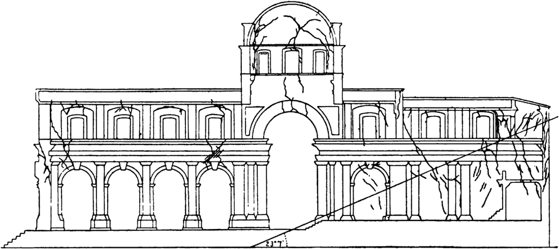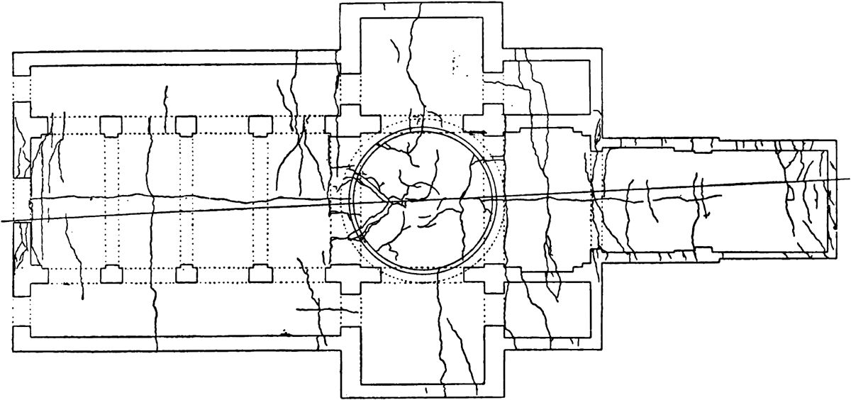 No building showed the different kinds of evidence on which Mallet relied as clearly as the cathedral church at Potenza, the plan of which is given in Fig. 5, and the vertical section along its axis in Fig. 12. This is a modern work, nearly 200 feet long, with its axis directed east and west. The walls are composed[16] [17]of fairly good rubble masonry and brick; and the arches in the nave and transepts, the semi-cylindrical roof and the central dome are made of brick. The fissures represented in both diagrams were drawn to scale by the cathedral architect before Mallet's arrival, and, as the work of an unbiassed observer, are of special value. Most of those in the roof, it will be seen, were transverse to the axial line of the church; but there were others parallel to this line, one in particular running right along the soffit of the nave and chancel. There were also numerous small fissures in the dome, due to local structural causes and therefore of varying direction, and a large portion of the dome slipped westward, leaving open fissures of seven to eight inches in width. The mean direction of the wave-path, as deduced from nine sets of fissures, none of which differs more than four degrees from the mean, is W. 2½° S. and E. 2½° N., which corresponds precisely with the direction of throw on the displaced portion of the dome. The great east and west fissures in the arch of the nave and chancel Mallet attributed to a second shock, of the existence of which there is ample evidence.
