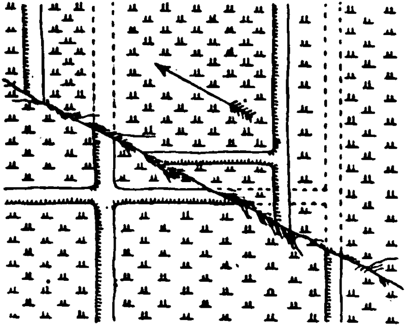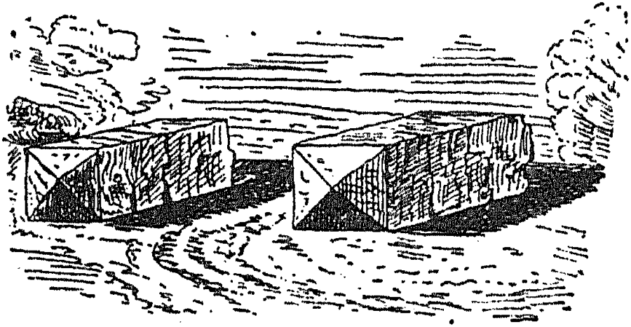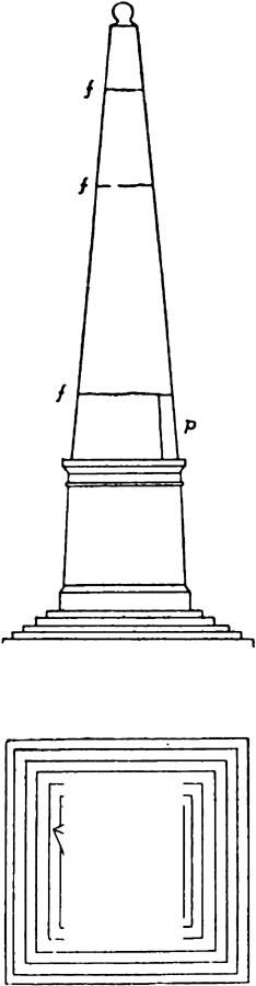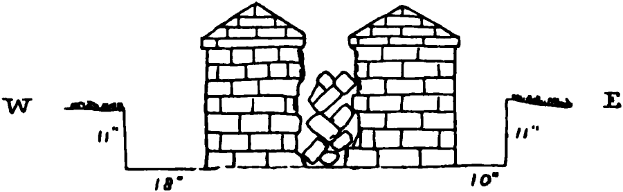 Next to fissures, Mallet made most use of overthrown objects, such as the two gate piers near Saponara, represented in Fig. 6. They were made of rubble ashlar masonry, three feet square and seven feet in height. Both were fractured clean off at the [18]level of the ground, the mortar being poor, and fell in directions that were accurately parallel, indicating a wave-path towards S. 39½°E. A few observations were also made on projected stones, fissures in nearly level ground, and the swinging of lamps and chandeliers; but their value was small, except as corroboration of the more important evidence afforded by fissures in the walls and roofs of buildings.