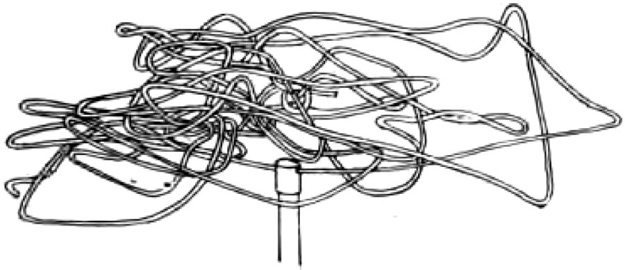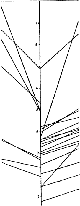 Remarks on Mallets Method.—It would have been more difficult in Mallet's day than it is now, to offer objections to his method of determining the position of the epicentre. The focus, as he was well aware, could not be a point, and, at places near the epicentre (the very places where most of his observations were made), there must be rapid changes of direction due to the arrival of vibrations from different parts of the focus. He records the occurrence of the so-called vorticose shocks at several places, though he attributes them to another cause. Perhaps the best known example of such a shock is that which has been so well illustrated by the late Professor Sekiya's model of the motion of an earth-particle during the Japanese earthquake of January 15th, 1887. The motion in this case was so complicated that the model was, for simplicity, made in three parts, the first of which alone is represented in Fig. 7.[10] It is clear that in such an earthquake, Mallet's method would utterly fail in giving definite results.