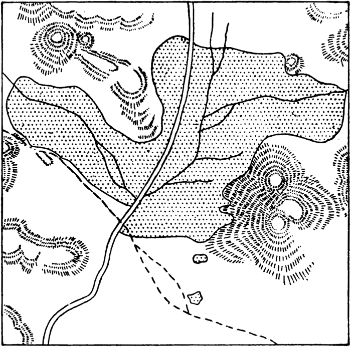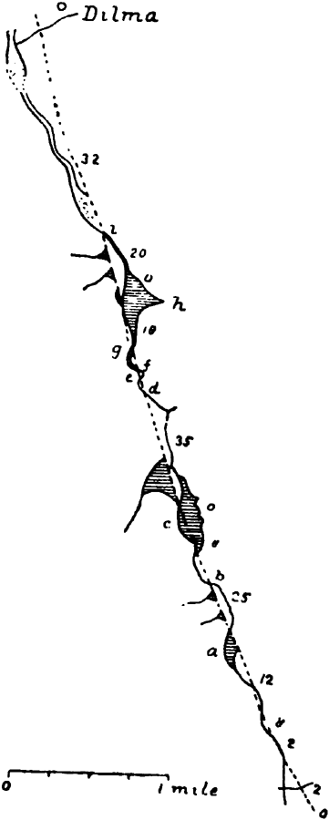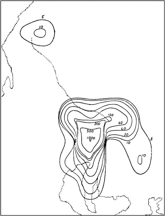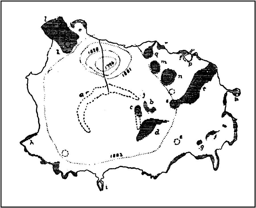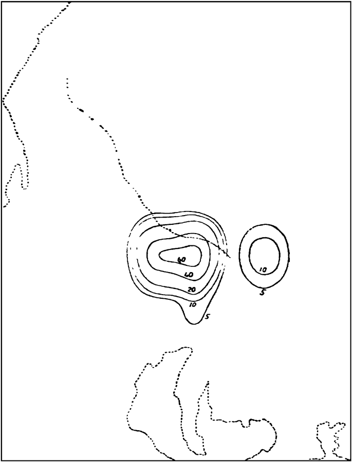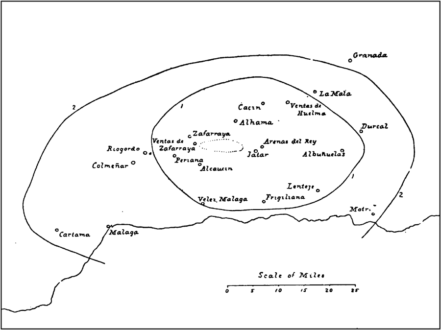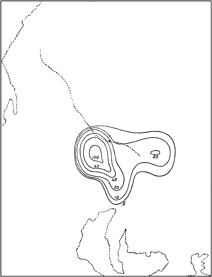The position of the meizoseismal area, to which Mallet devoted most of his time, is indicated by the small oval area marked 1 in Fig. 2, represented on a larger scale in Fig. 9. It is 40 miles long and 23 miles [10]wide,[7] and contains 950 square miles. Within this area, the loss of life was great and most of the towns were absolutely prostrated.