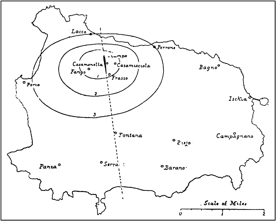 Thus, the Neapolitan earthquake possesses interest from a historical point of view; it is the first earthquake in the study of which modern scientific methods were employed. The Ischian earthquakes are described as examples of those connected with [2]volcanic action; the Andalusian earthquake is chiefly remarkable for the recognition of the unfelt earth-waves; that of Charleston for the detection of the double epicentre and the calculation of the velocity with which the vibrations travelled. In the Riviera earthquake are combined the principal features of the last two shocks with several phenomena of miscellaneous interest, especially those connected with its submarine foci. The Japanese earthquake is distinguished from others by its extraordinary fault-scarp and the very numerous shocks that followed it. The Hereford earthquake is a typical example of a twin earthquake, and provided many observations on the sound phenomena; while the Inverness earthquakes are important on account of their connection with the growth of a well-known fault. The great Indian earthquake owns few, if any, rivals within historical times, whether we consider the intensity of the disturbance or the diversity and interest of the phenomena displayed by it—the widespread changes in the earth's crust, both superficial and deep-seated, and the tracking of the unfelt pulsations completely round the globe.