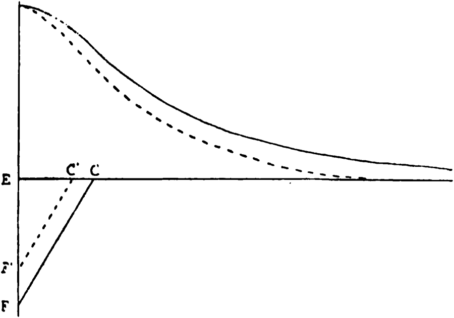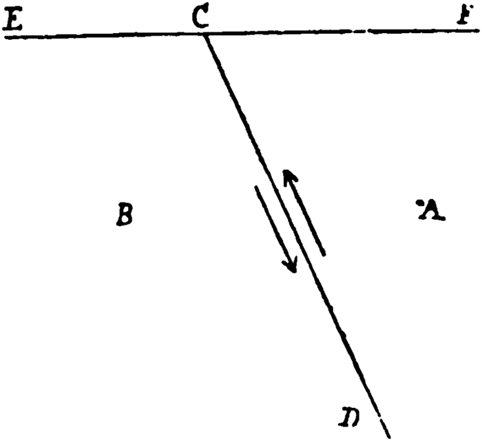 Mallet argued that the direction of the wave-path FPA, or its equivalents, the horizontal direction EPL and the angle of emergence EPF, should be discoverable from the effects of the shock at P. The cracks in damaged buildings, he urged, would be at right angles to the wave-path FPA; overturned monuments or gate-pillars should fall along the line EPL, either towards or from the epicentre according to their conditions of support; loose or slightly attached bodies, such as the stone balls surmounting gate-pillars, should be projected nearly in the direction of [14]the wave-path FPA, and their subsequent positions, supposing the balls not to have rolled, should give the horizontal direction EPL of the wave-path, and might, in some circumstances, determine the angle of emergence and the velocity with which they were projected. I shall return to details later on. For the present, it is clear that, in the destruction wrought by the earthquake, Mallet expected to find the materials most valuable for his purpose. Indeed, so obvious did this mode of examination appear to him, that he could not conceal his surprise at the blindness of his predecessors. They seem, he says, "to have been perfectly unconscious that in the fractured walls and overthrown objects scattered in all directions beneath their eyes, they had the most precious data for determining the velocities and directions of the shocks that produced them."