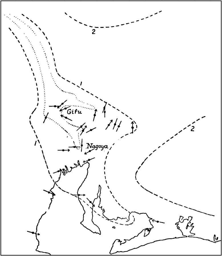 It will be seen from this figure that most of the stone lamps fell in directions between west and south-west, and it is remarkable that the mean direction of fall is S. 70° W.,[12] which is exactly the same as that of the great oscillation. Somewhat similar results were obtained by this able seismologist at different places affected by the great Japanese earthquake of 1891 (Figs. 43 and 44), and the study of the apparent directions observed during the Hereford earthquake of 1896 leads to the same conclusion.