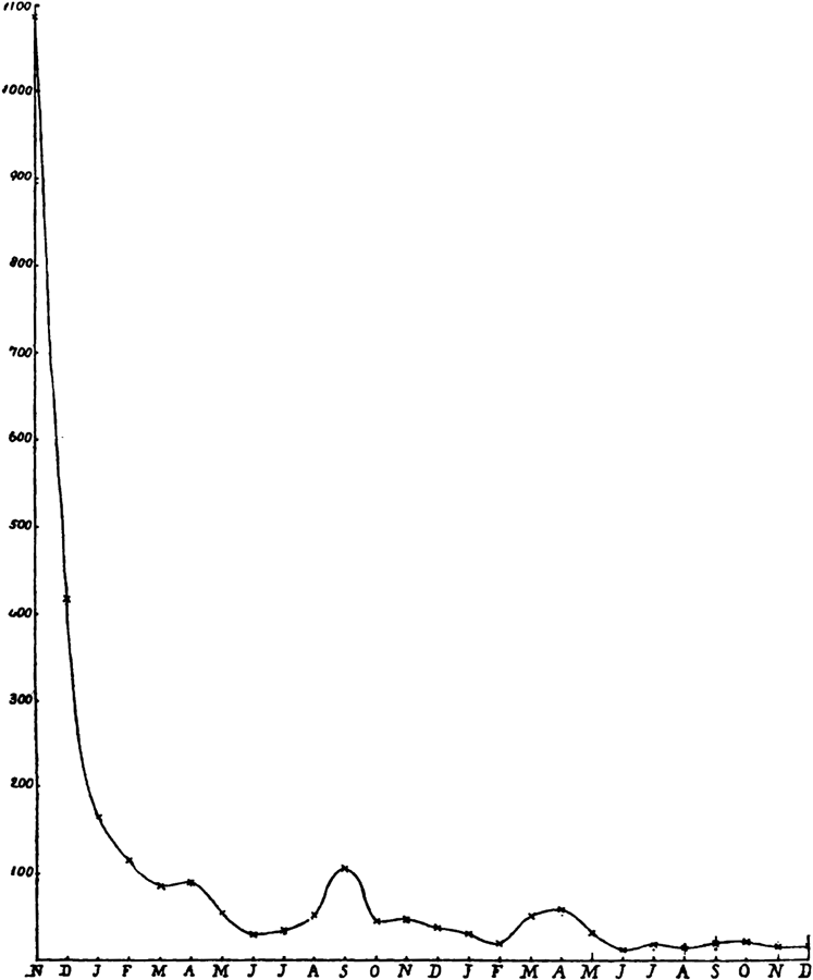 So destructive was the Neapolitan earthquake of this year (Mallet ranks it third among European earthquakes in extent and severity), that nearly a week elapsed before any news of it reached the outer world. Without further loss of time, he applied for and obtained a grant of money from the Council of the Royal Society, and proceeded early in the following February to what was then the kingdom of Naples. Armed with letters of authority to different officials, he visited the chief towns and villages in the meizoseismal area; and, in spite of unfavourable weather and the difficulties of travelling in a country so recently devastated, he completed his examination in little more than two months. It was a task, surely, that would have baffled any but the most enthusiastic investigator or one unspurred by the feeling that he possessed the key to one of the most obscure of Nature's problems.