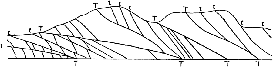 That tectonic earthquakes are closely connected with the formation of faults seems now established beyond doubt. They occur far from all traces of recent volcanic action. Their isoseismal lines are elongated in directions parallel to known faults, and this is sometimes the case in one and the same district with faults that occur at right angles to one another. Indeed, when several isoseismals are carefully drawn, it is possible from their form and relative position to predict the position of the originating fault.[2] The [6]initial formation and further spreading of the rent may be the cause of a few earthquakes, but by far the larger number are due to the subsequent growth of the fault. The relative displacement of the rocks adjoining the fault, which may amount to thousands of feet, occasionally even to miles, is the result, not of one great movement, but of innumerable slips taking place in different parts of the fault and spread over vast ages of time. With every fault-slip, intense friction is suddenly brought into action by the rubbing of one mass of rock against the other; and, according to the modern view, it is this friction that gives rise to the earthquake waves.