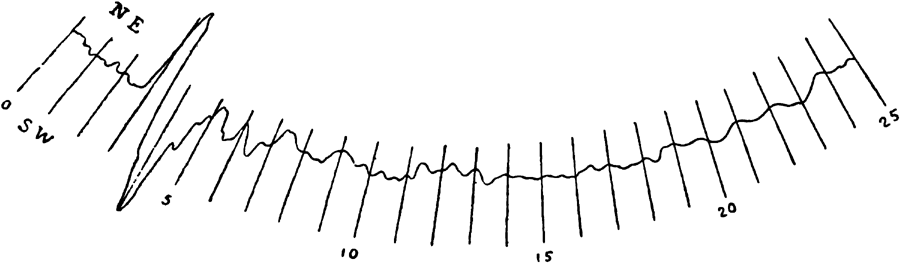 While this shock was one of great complexity, another Japanese earthquake, that of June 20th, 1894, was unusually simple in character. The movement at Tokio consisted of one very prominent oscillation [19]with a total range of 73 mm. or 2.9 inches in the direction S. 70° W.; the vibrations which preceded and followed it being comparatively small. Most, if not all, of the damage caused by the earthquake must have been due to this great oscillation; and yet the cylindrical stone-lamps so common in Japanese gardens were found by Professor Omori to have fallen in many different directions. Taking only those which had circular bases, twenty-nine were overthrown in directions between north and east, sixteen between east and south, eighty-one between south and west, and fourteen between west and north.[11] Fig. 8 represents Professor Omori's results graphically, [20]the line drawn from O to any point being proportional to the number of lamps which fell in directions between 7½° on either side of the line.
