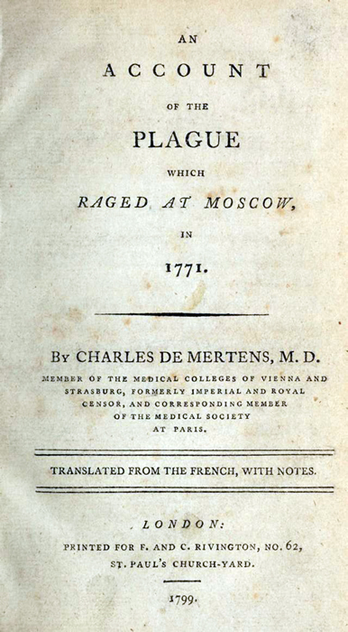 This account is translated from a treatise republished in French, and originally written in Latin by Dr. Mertens, under the following title: “Traité de la Peste, contenant l’Histoire de celle qui a régné à Moscou en 1771; par Charles de Mertens, Docteur en Medecine, &c. ouvrage publié d’abord en Latin[3]; actuellement mis en François, &c. à Vienne, 1784.” The author (who was physician to the[vii] Foundling-Hospital, at Moscow, and resided in that city during the whole of the time that the plague raged there) divides his treatise into four chapters; in the first of which he gives a history of the plague as it appeared at Moscow; in the second, he treats of the diagnosis; in the third, of the curative treatment; and in the fourth, of the precautions or methods of prevention.
