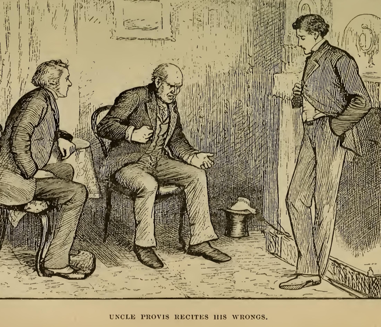 “Now,” said Pumblechook, and all this with a most exasperating air of saying in the cause of virtue what was perfectly convincing and conclusive, “I will tell you what to say to Joseph. Here is Squires of the Boar present, known and respected in this town, and here is William, which his father’s name was Potkins if I do not deceive myself.”
