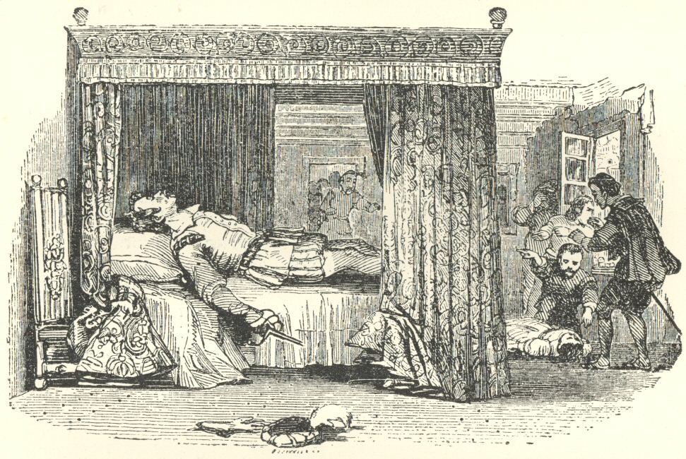 As he did not appear among us at his usual hour next morning, we knocked gently at his door. No answer being given, it was softly opened; and then, to our surprise, we saw him seated before the ashes of his fire, with a little table I was accustomed to set at his elbow when I left him for the night at a short distance from him, as though he had pushed it away with the idea of rising and retiring to his bed. His crutch and footstool lay at his feet as usual, and he was dressed in his chamber-gown, which he had put on before I left him. He was reclining in his chair, in his accustomed posture, with his face towards the fire, and seemed absorbed in meditation,—indeed, at first, we almost hoped he was.