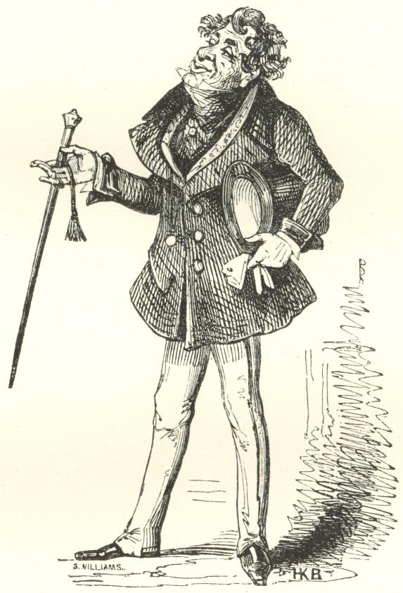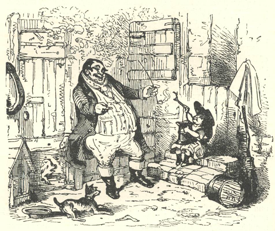 Not confining himself to a mere verbal description of his grandson’s abilities, Mr. Weller, when tea was finished, invited him by various gifts of pence and halfpence to smoke imaginary pipes, drink visionary beer from real pots, imitate his grandfather without reserve, and in particular to go through the drunken scene, which threw the old gentleman into ecstasies and filled the housekeeper with wonder. Nor was Mr. Weller’s pride satisfied with even this display, for when he took his leave he carried the child, like some rare and astonishing curiosity, first to the barber’s house and afterwards to the tobacconist’s, at each of which places he repeated his performances with the utmost effect to applauding and delighted audiences. It was half-past nine o’clock when Mr. Weller was last seen carrying him home upon his shoulder, and it has been whispered abroad that at that time the infant Tony was rather intoxicated. [306]