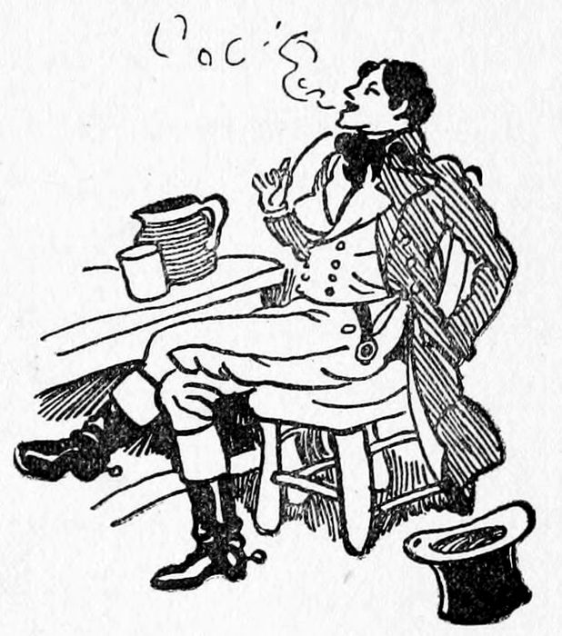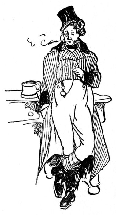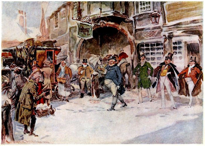 And now the bugle plays a lively air as the coach rattles through the ill-paved streets of a country town; and the coachman, undoing the buckle which keeps his ribands together, prepares to throw them off the moment he stops. Mr. Pickwick emerges from his coat collar, and looks about him with great curiosity; perceiving which, the coachman informs Mr. Pickwick of the name of the town, and tells him it was market-day yesterday, both which pieces of information Mr. Pickwick retails to his fellow-passengers, whereupon they emerge from their coat collars too, and look about them also. Mr. 33Winkle, who sits at the extreme edge, with one leg dangling in the air, is nearly precipitated into the street, as the coach twists round the sharp corner by the cheesemonger’s shop, and turns into the market-place; and before Mr. Snodgrass, who sits next to him, has recovered from his alarm, they pull up at the inn yard, where the fresh horses, with cloths on, are already waiting. The coachman throws down the reins and gets down himself, and the other outside passengers drop down also, except those who have no great confidence in their ability to get up again, and they remain where they are, and stamp their feet against the coach to warm them; looking with longing eyes and red noses at the bright fire in the inn bar, and the sprigs of holly with red berries which ornament the window.