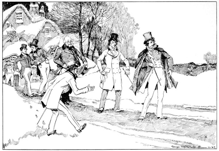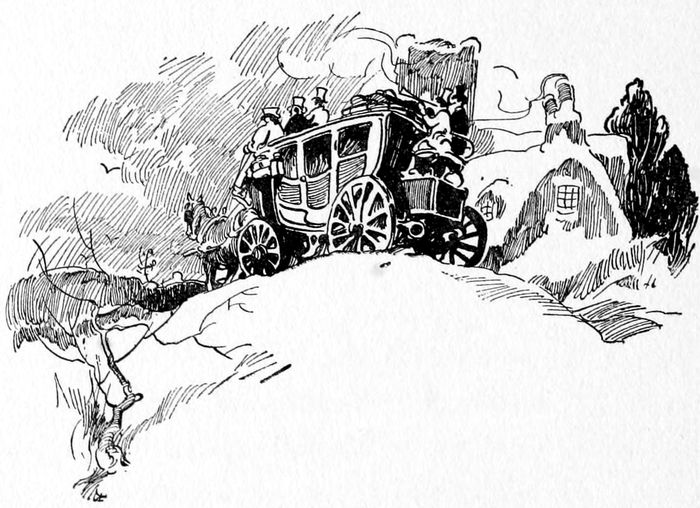 34But the guard has delivered at the corn-dealer’s shop, the brown paper packet he took out of the little pouch which hangs over his shoulder by a leathern strap, and has seen the horses carefully put to, and has thrown on the pavement the saddle which was brought from London on the coach-roof, and has assisted in the conference between the coachman and the hostler about the grey mare that hurt her off-fore-leg last Tuesday, and he and Mr. Weller are all right behind, and the coachman is all right in front, and the old gentleman inside, who has kept the window down full two inches all this time, has pulled it up again, and the cloths are off, and they are all ready for starting, except the “two stout gentlemen,” whom the coachman enquires after with some impatience. Hereupon the coachman, and the guard, and Sam Weller, and Mr. Winkle, and Mr. Snodgrass, and all the hostlers, and every one of the idlers, who are more in number than all the others put together, shout for the missing 35gentleman as loud as they can bawl. A distant response is heard from the yard, and Mr. Pickwick and Mr. Tupman come running down it, quite out of breath, for they have been having a glass of ale a-piece, and Mr. Pickwick’s fingers are so cold that he has been full five minutes before he could find the sixpence to pay for it. The coachman shouts an admonitory “Now, then, gen’lm’n,” the guard re-echoes it—the old gentleman inside, thinks it a very extraordinary thing that people will get down when they know there isn’t time for it—Mr. Pickwick struggles up on one side, Mr. Tupman on the other, Mr. Winkle cries “All right,” and off they start. Shawls are pulled up, coat collars are re-adjusted, the pavement ceases, the houses disappear; and they are once again dashing along the open road, with the fresh clear air blowing in their faces, and gladdening their very hearts within them.