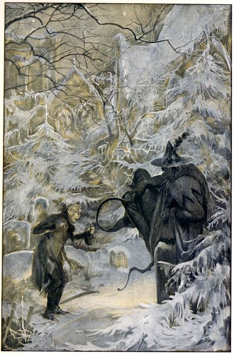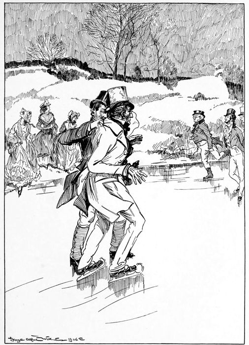 Old Wardle led the way to a pretty large sheet of ice; and the fat boy and Mr. Weller, having shovelled and swept away the snow which had fallen on it during the night, Mr. Bob Sawyer 129adjusted his skaits with a dexterity which to Mr. Winkle was perfectly marvellous, and described circles with his left leg, and cut figures of eight; and inscribed upon the ice, without once stopping for breath, a great many other pleasant and astonishing devices, to the excessive satisfaction of Mr. Pickwick, Mr. Tupman, and the ladies; which reached a pitch of positive enthusiasm, when old Wardle and Benjamin Allen, assisted by the aforesaid Bob Sawyer, performed some mystic evolutions, which they called a reel.
