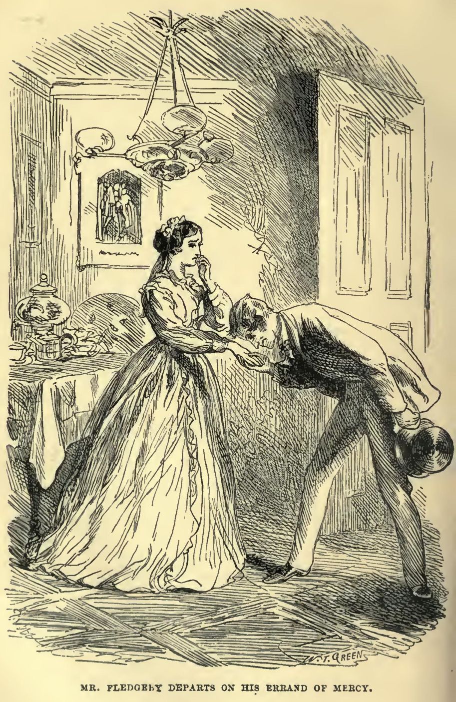 ‘Hardly so, I think,’ the stubborn Mortimer strikes in. ‘I take the question to be, whether such a man as you describe, Lady Tippins, does right or wrong in marrying a brave woman (I say nothing of her beauty), who has saved his life, with a wonderful energy and address; whom he knows to be virtuous, and possessed of remarkable qualities; whom he has long admired, and who is deeply attached to him.’