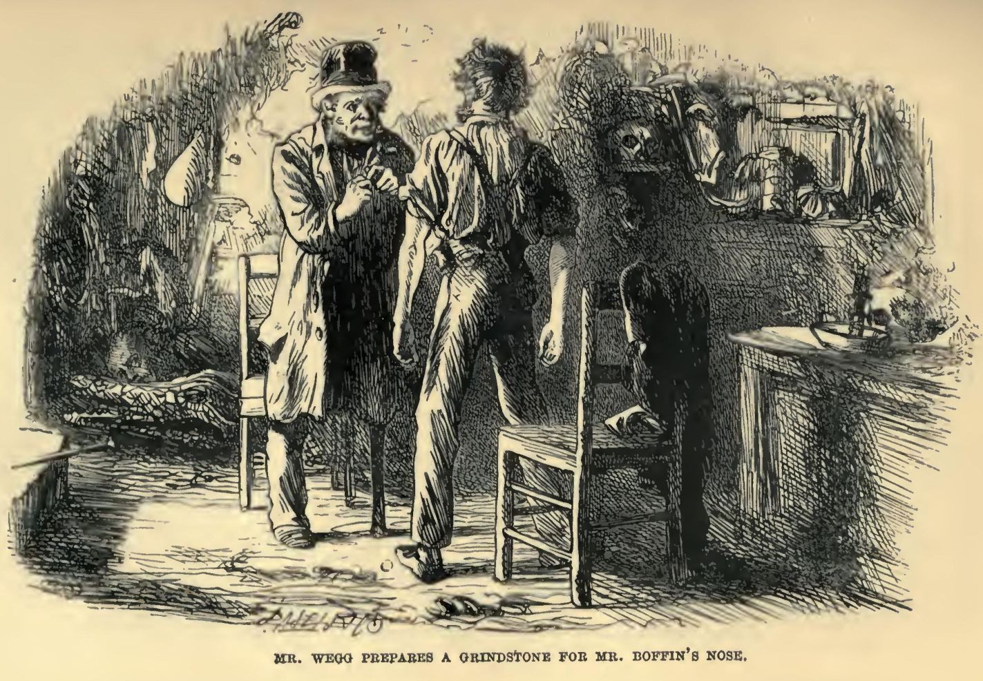 In this complicated dilemma, Mr Veneering approaches the large man with extended hand and, smilingly assures that incorrigible personage that he is delighted to see him: who in his fatal freshness instantly replies: