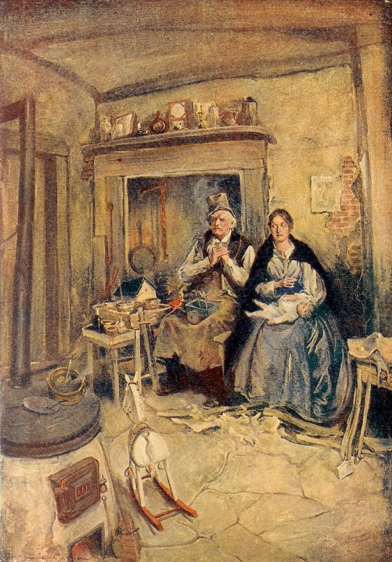 "There! There's the teapot, ready on the hob!" said Dot; as briskly busy as a child at play at keeping house. "And there's the cold knuckle of ham; and there's the butter; and there's the[112] crusty loaf, and all! Here's a clothes basket for the small parcels, John, if you've got any there. Where are you, John? Don't let the dear child fall under the grate, Tilly, whatever you do!"