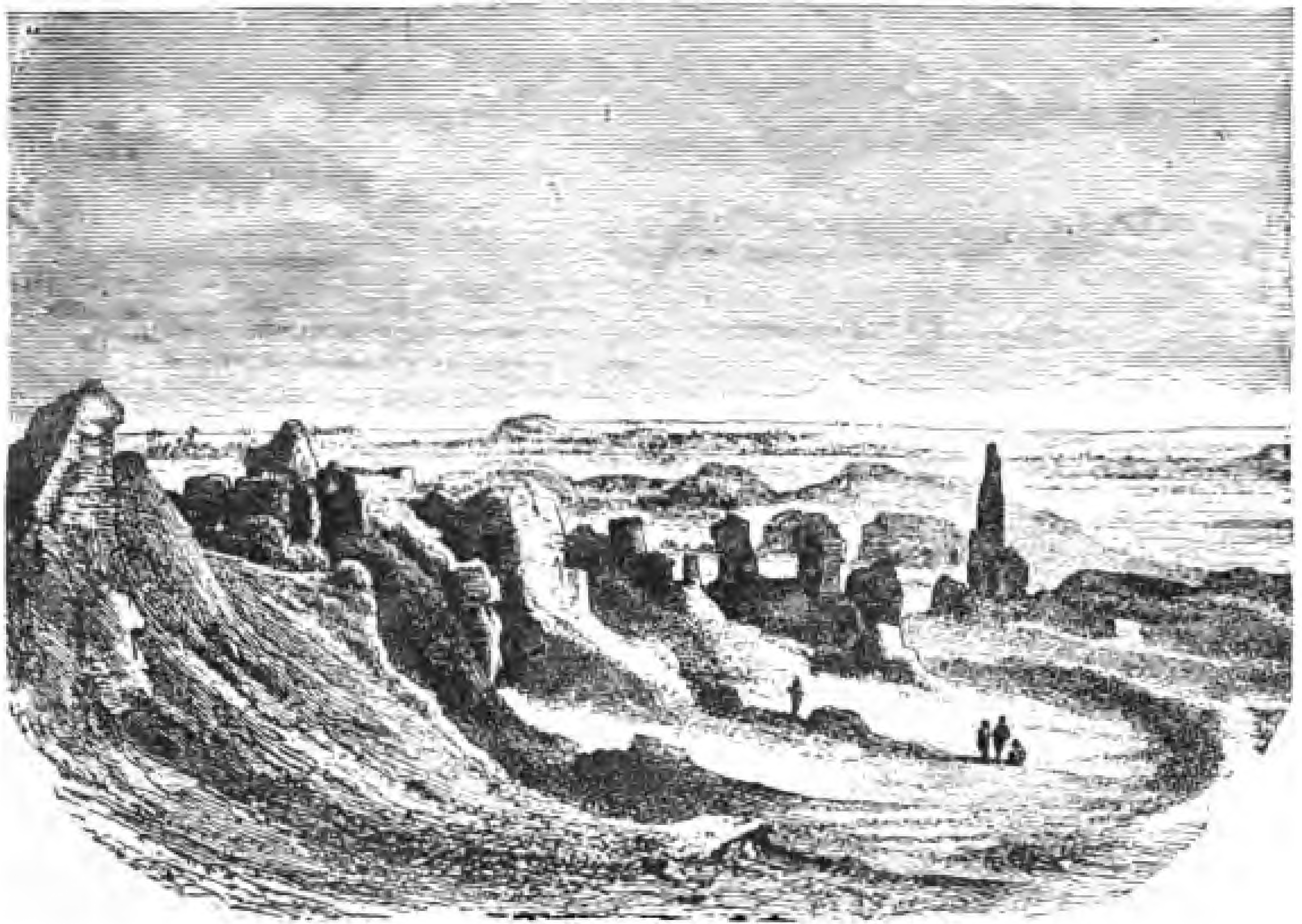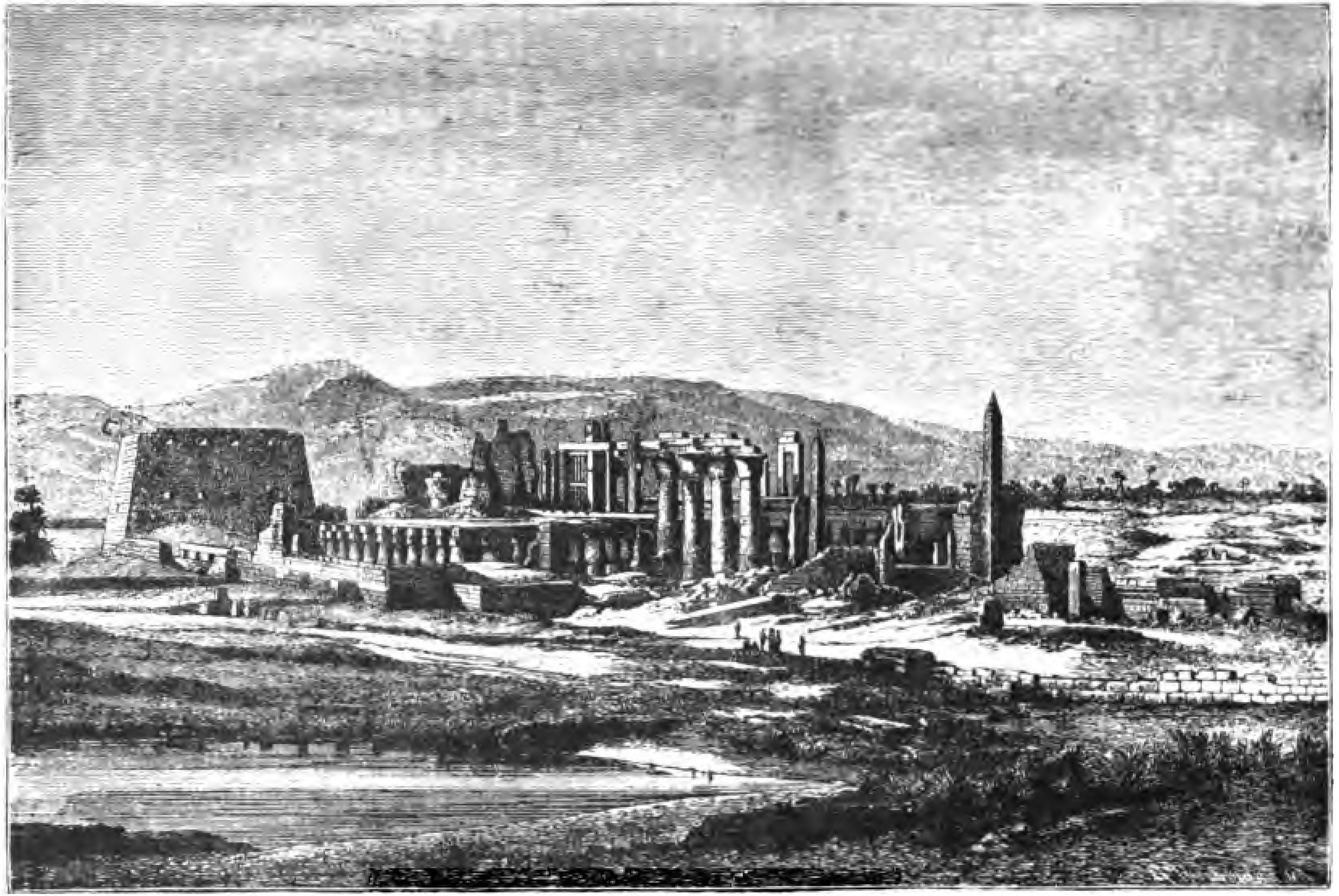 Another city, however, claims our attention as on an almost equal footing with Heliopolis as regards obelisks. Thebes in Upper Egypt, the famous city of one hundred gates, as Homer calls it, the largest city of the ancient world, had besides its many grand temples and palaces a number of the largest obelisks extant. Four of them still tower above the piles of ruins scattered on all sides, while a still larger number must lie buried deep in the ground. It was quite appropriate that here in the metropolis of Upper Egypt, where Pharaoh passed much of his time and where he was crowned with all the pomp and magnificence of a victor, a number of obelisks should proclaim his praise. They were made for the living to gaze upon, and were therefore erected on the eastern bank of the Nile where the city proper stood, while the western bank was wholly surrendered to the dead. The modern villages of Karnak (قرناق) and Luxor (اقصر) now mark the spot where Thebes was situated. However, if we are to believe a traveler, Villiers Stuart, who found two prostrate obelisks of an old dynasty in the necropolis or cemetery on the western bank of the Nile, and take into account that Lepsius found his obelisk at Gizeh, the necropolis of Memphis, also on the western bank of the Nile, we must infer that the oldest obelisks were not always set up with a view to being admired by the living, but simply served as head-stones for the dead.