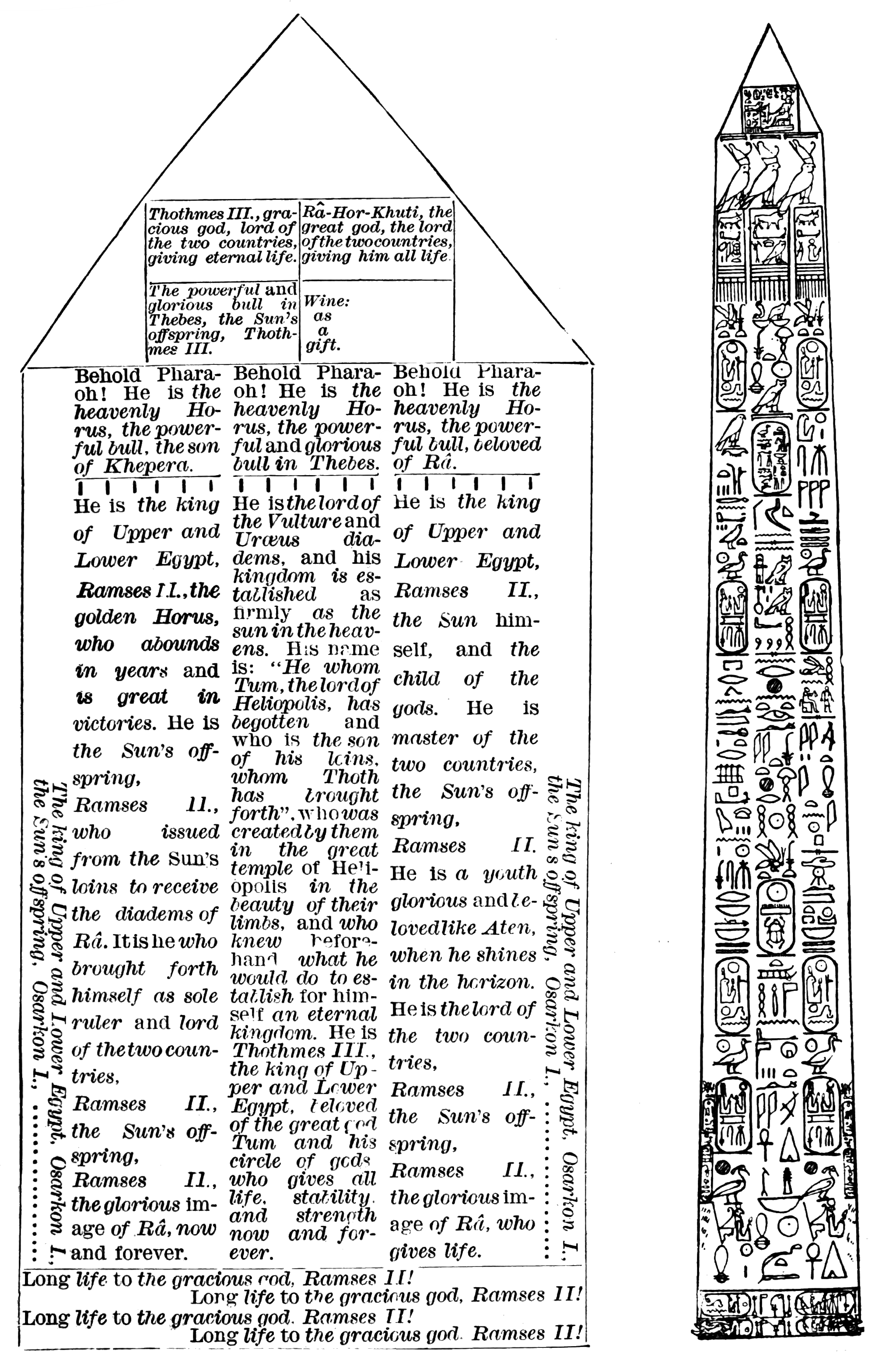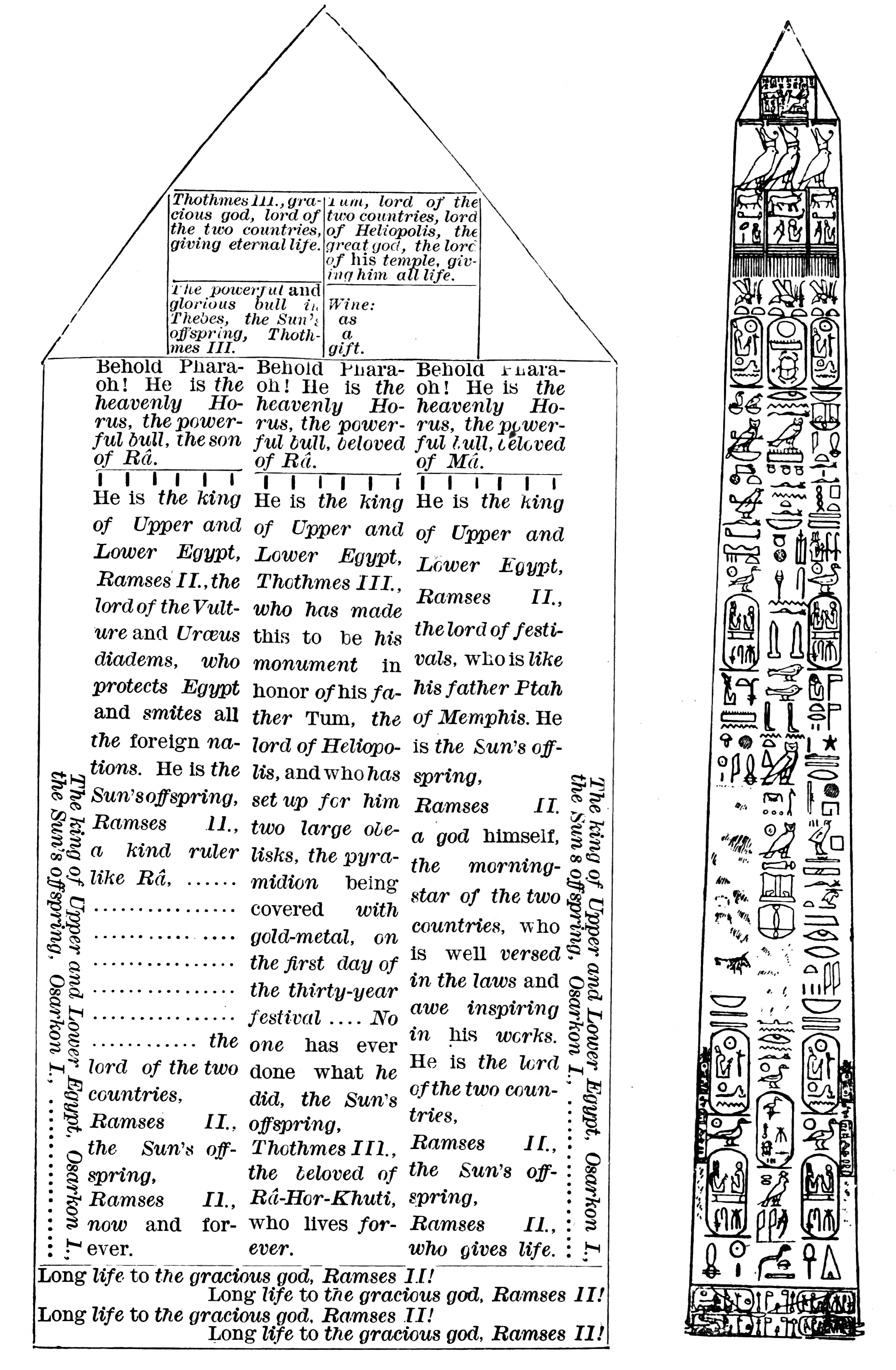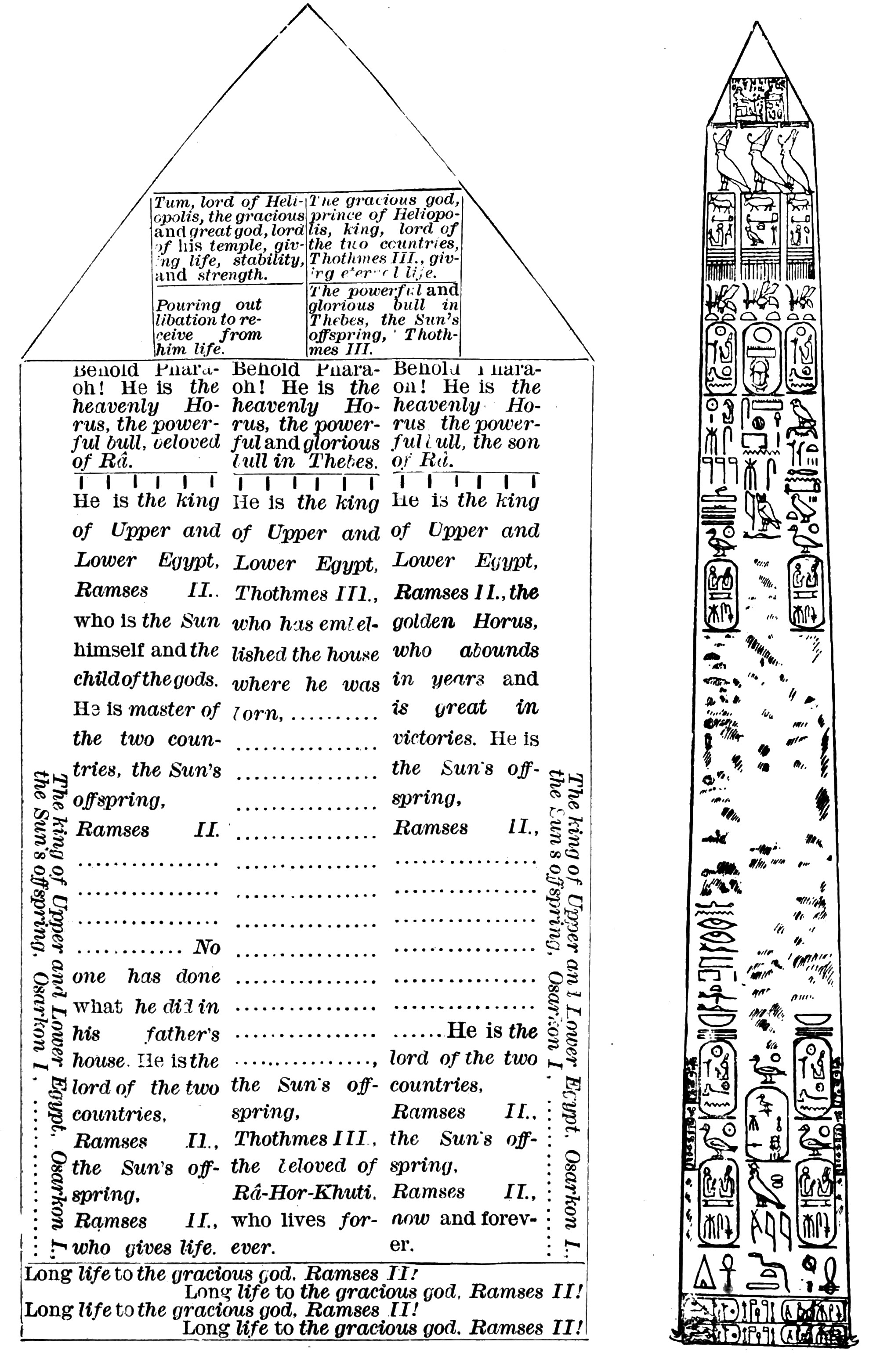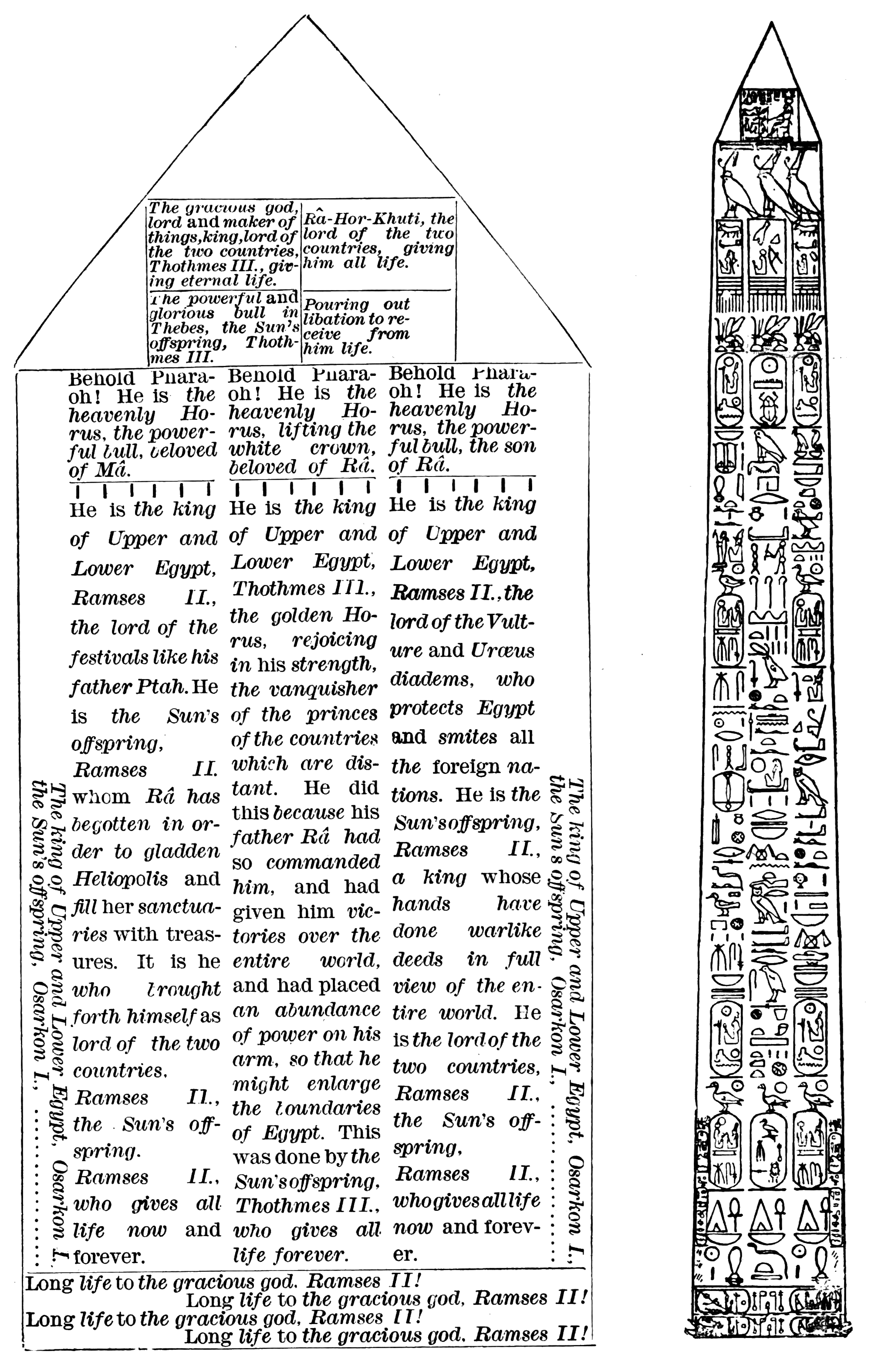 I. Inscriptions of Thothmes III. 46-61. The Pyramidion. 46-55. The Obelisk Proper. 56-61. {iv}II. Inscriptions of Ramses II. 62-71. Vertical columns. 62-70. The base. 71. III. Inscriptions of Osarkon I. 71-72. |