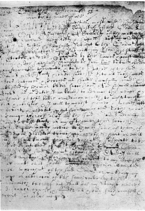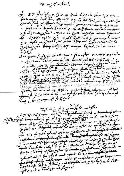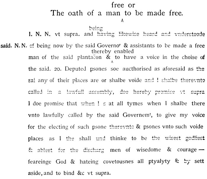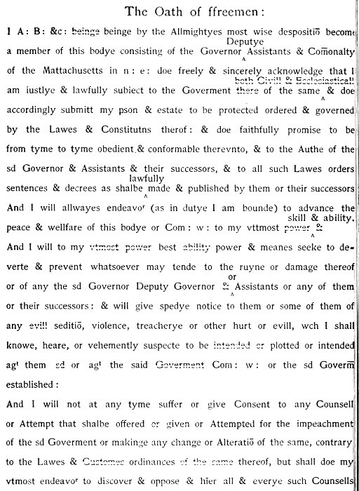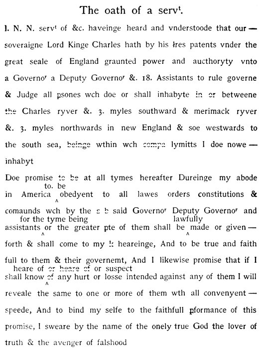 I, A. B. &c. being, by the Almighties most wise disposic̄on, become a membr of this body, consisting of the Goūnr, Deputy Goūnr, Assistants, & a comnlty of the Mattachusets in Newe England, doe, freely & sincerely acknowledge that I am iustly & lawfully subject to the goūmt of the same, & doe accordingly submitt my pson & estate to be ptected, ordered, & goūned by the lawes & constituc̄ons thereof, & doe faithfully pmise to be from time to time obedient & conformeable therevnto, & to the authie of the said Goūnr & Assistants & their successrs, & to all such lawes, orders, sentences, & decrees as shalbe lawfully made & published by them or their successors; and I will alwaies indeavr (as in dutie I am bound) to advance the peace & wellfaire of this bodie or com̄onwealth to my vtmost skill & abilitie; & I will, to my best power & meanes, seeke to devert & prevent whatsoeuer may tend to the ruyne or damage thereof, or of any the said Goūnr, Deputy Goūnr, or Assistants, or any of them, or their successrs, and will giue speedy notice to them, or some of them, of any sedic̄on, violence, treachery, or other hurt or euill which I shall knowe, heare, or vehemtly suspecte to be plotted or intended against the said com̄onwealth, or the said goumt established; and I will not att any time suffer or giue consent to any counsell or attempt that shalbe offered giuen, or attempted for the impeachmt of the said goūmt, or makeing any change or alterac̄on of the same, contrary to the lawes & ordinances thereof, but shall doe my vtmost endeavr to discover, oppose, & hinder, all & eūy such counsell & attempts. Soe helpe me God. [1631.]