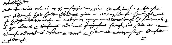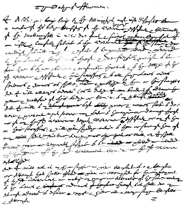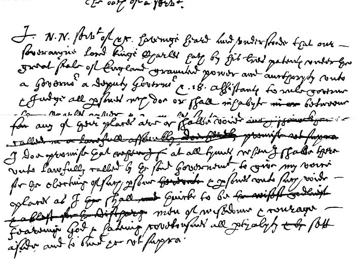 You shall be truly loyall to our Sov Lord King Charles, his heires & successors, [the State & Governt of England as it now stands.] You shall not speake or doe, devise or advise any thing or things act or acts directly or indirectly by land or water, that doth shall or may tend to the destrucc̄on or overthrow of this pr̄nt plantac̄ons Colonies or Corporac̄on of New Plymouth, Neither shall you suffer the same to be spoken or done but shall hinder oppose & discover the same to the Govr̄ & Assistants of the said Colony for the time being or some one of them. You shall faithfully submit unto such good & wholesome laws & ordnanc & as either are or shall be made for the ordering & governmt of the same, and shall endeavor to advance the growth & good of the severall Colonies plantations wth in the limit & of this Corporac̄on by all due meanes & courses. All wch you promise & sweare by the name of the great God of heaven & earth simply truly & faithfully to pforme as you hope for help frō God who is the God of truth & punisher of falsehood. [1636]