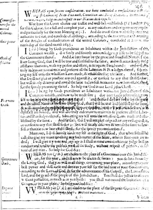 I, A. B., being, by Gods providence, an inhabitant & ffreeman within the jurisdicc̄on of this com̄onweale, doe freely acknowledge my selfe to be subiect to the govermt thereof, & therefore doe heere sweare, by the greate & dreadfull name of the euerlyveing God, that I wilbe true & faithfull to the same, & will accordingly yeilde assistance & support therevnto, with my pson & estate, as in equity I am bound, & will also truely indeavr to mainetaine & preserue all the libertyes & previlidges thereof, submitting my selfe to the wholesome lawes & orders made & established by the same; and furthr, that I will not plott nor practise any evill against it, nor consent to any that shall soe doe, but will timely discover & reveale the same to lawfull aucthority nowe here established, for the speedy preventing thereof. Moreouer, I doe solemnely binde myselfe, in the sight of God, that when I shalbe called to giue my voice touching any such matter of this state, wherein ffreemen are to deale I will giue my vote & suffrage, as I shall iudge in myne owne conscience may best conduce & tend to the publique weale of the body, without respect of psons, or favr of any man. Soe helpe mee God in the Lord Jesus Christ. [1634.]