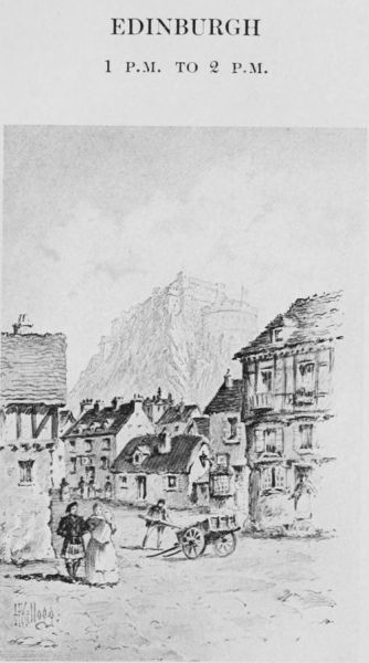 Up there on the gusty heights of Edinburgh no one ever inquires the time at one o’clock in the afternoon. Precisely at the second, a ball flutters to the top of the Nelson flagstaff on Calton Hill and a cannon booms from a battery at Castle Rock; and watches are then set by merchants all over town, by shepherds on the shaggy Pentland Hills, and sailors on ships in the lee of Leith. And one o’clock is the very best time Edinburgh could have fixed upon to encourage her people to look up and about and behold her at her finest. It is luncheon-hour, and when the sun is kindly, “Auld Reekie” is just about as garish and stimulating as it is possible for a town of such dignified traditions and questionable climate ever to become. The air freshens in from blustering Leith, and fair Princes Street wears its most beguiling smiles. One thrills with the joy of being alive in so brave and bonny a world, with the bluebells and heather of Old Scotland about him and this town of song and story at his feet. He gazes at the cheerful crowds moving[4] leisurely along the valley gardens elegant with statues and flowered lawns, or across at the frowzy heads in rickety garret windows away up among the palsied gables of ancient High Street, and he knows that over there is the Canongate of stern tradition and the storied St. Giles’ and black Holyrood, and beyond them he sees the Salisbury Crags, a gaunt palisade halfway up to lofty Arthur’s Seat. He has just arrived, perhaps, with the glow on his face of all he has read and heard of this famed place, and the bugles are singing on Castle Hill and the Edinburgh bells are ringing.
