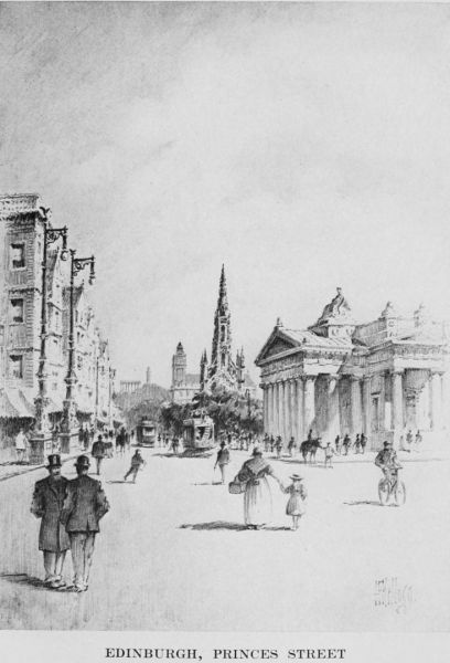 You might think, to hear Americans talk at home, that every other Edinburgh man carries a dirk or a claymore under a tartan and wears a ferocious red beard like the pictures of Rob Roy; that people go about in plaid shawls and tam o’shanters, and that most society functions end up with a Highland fling. One may see at wayside railroad stations, as in our own country, wild, hair-blown lassies with flaming cheeks running in from the hills to have a look at the train; but with some such mild exception, if it is one, the Scots on their native heath are, of course, precisely what we are used to elsewhere. Types apart, the man of the streets of Edinburgh looks entirely familiar—shrewd and combative, rugged and perhaps hard, slouchy and indifferent in the matter of dress, hobnailed and be-capped. There is something tremendously genuine and wholesome about him. He is merry and brisk and lively, often; but you would not call him ever quite gay—at least with that sparkle that dances in the eyes you look into on the Paris boulevards. You could scarcely, for instance, imagine a Scotchman singing a barcarolle![8] Best of all they are honest and sincere, and one takes to them at once. Here are the lassies and laddies you have long sung about, fresh-faced and debonair. Cheerful fearlessness shines out of their frank blue eyes, and they look to dare all things and be utterly unafraid. The square foreheads of the older men, the austere cheek bones and strong chins, unscroll history to the observer and make him think of savage broils along the border, of fierce finish-fights throughout the wild Highlands, and of the deathless Grays of Waterloo. You may defeat a Scotchman, but he will never admit it, and if he is all-Scotch he will not even know it. They are brave, witty, and devoted, and many a person will take issue with Swift for finding their conversation “hardly tolerable,” and with Lamb for pronouncing their “tediousness provoking” and for giving them up in despair of ever learning to like them.