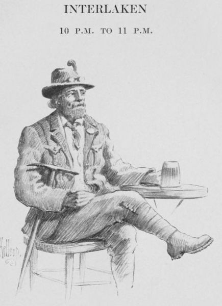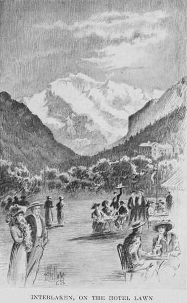 When he comes out on the lawns he finds the guests still thronging the verandas, although it is nearly eleven and prodigies of mountaineering are slated for the morrow, and he hears the bands still engaged with Puccini and the latest Vienna successes. In the fragrant, dewy gardens fountains are playing, and lovers are discreetly screening behind clumps of flowering shrubs. Returning excursionists are excitedly vocal over the illumination of the Giessbach, whence they have just arrived in one of those pompous lake steamers whose sure and cautious pace reminded the satirical Victor Tissot of “the dignified motion of a canalboat.” To hear these enthusiasts, this appears to have been one more of those exceptionable occasions that the absent are always missing,[291] and that the renowned waterfall never before roared and tumbled and foamed half so extravagantly in making its long, mad plunge through the dusky, dark-green firs. Out on the Höheweg a walking-party in knickerbockers and hobnailed shoes, and with edelweiss stuck in green felt hats, are flourishing their alpenstocks and driving bargains with sunburned guides whose names, undoubtedly, are either Melchior or Mathias; these latter, we are to learn, are of a fearless but canny and laconic nature, “economical as gypsies and punctual as executioners.”