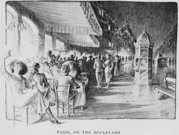 The life you then see about you is the usual thing here; to a stranger, novel and amusing; to a Parisian, altogether important and absorbing—an indispensable part of his existence. The setting is of soft carpets, palms, red velvet divans, chandeliers, and a crush of small, marble-topped tables. The place is crowded to the point of discomfort. A thin veil of smoke hangs over all. There are people in all kinds of street clothes and evening dress, ladies in opera cloaks and gentlemen in immaculate white waistcoats. There are ordinary individuals and fantastic “types”; ruddy, portly bourgeois who shout “mon vieux” at each other and make a prodigious racket generally; and nervous old beaux in toupées who fancy themselves in drafts. Occupations vary. Ladies are dining on champagne and truffles; the man at your elbow is writing a letter; another is looking through the illustrated papers; another has called for ink and paper and is casting up the day’s expenditures; rubbers of dominoes and écarté are being played out; there is a continual running to the telephone-booths and you hear the muffled calls of “Allô!”—and all the time an orchestra is holding forth in the corner. The clatter of chairs and dishes and the confused rattle of conversation is amazing. Wit whets on wit. Everybody has an[352] opinion and is anxious to back it. Politicians bang their fists on the tables and address one another as “citoyen.” Philosophers have it out, Cartesian against Hegelian. Poets quote from their latest lyrics and are tremendously applauded. Novelists dispose of rival books with a scornful shrug and a withering mot. And the playwright, by universal concession, is supreme cock of the walk.