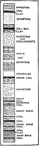 The bulk of evidence seems to favor this view, but there is another. Perhaps the coal-beds are not the sites of former swamps, but of estuaries and ocean shores where the plant material settled down, in still water, after a long drift down the ancient rivers from its place of origin. It is not impossible that both explanations are correct; some coal-beds having been formed in one way, and some in the other. With the progress of time the deposits of sand were compacted into sandstone, and the mud and clay into shale; while the layers of vegetation were solidified by pressure, some of their constituents were vaporized and expelled by heat, and the final product was coal.