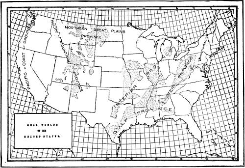 The coal-producing areas of the country are divided into six great divisions, known as the Eastern Province, the Interior Province, the Gulf Province, the Northern Great Plains Province, the Rocky Mountain Province, and the Pacific Coast Province. The Eastern Province contains probably nine-tenths of the high-rank coal of the country. It is made up of the anthracite regions of Pennsylvania and Rhode Island, the Atlantic coast region of Virginia and North Carolina, and the great Appalachian region, which embraces all the bituminous and semi-bituminous coal of what is called the “Appalachian trough.” The state of Pennsylvania produces 47 per cent. of all the coal mined in the country, and nearly all of the anthracite.