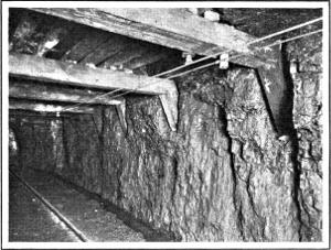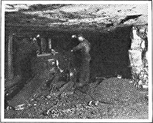 The actual mining is done in the rooms, and different methods are in use. Anthracite is generally “shot from the solid”; that is, blasted out from the face of the coal without any preliminary cutting. This method is objectionable, especially in bituminous mines (where it is, however, much practiced), because the large charges of powder it requires produce a great deal of coal-dust and weaken the roof and pillars, often leading to falls of coal and fatal accidents. A better plan consists of “undercutting” the coal before it is blasted out. A long groove is made at the level of the floor, either with a pick or with a coal-cutting machine. Holes are then drilled some distance above the groove for the insertion of the blasting charges, and the coal is blasted down. A single shot will sometimes dislodge a ton or two of coal.