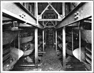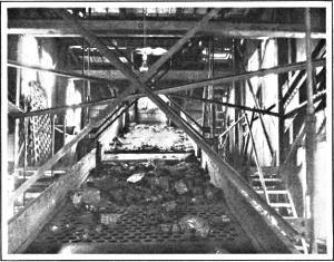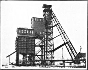 The elevator used for hoisting in the mine shaft is called a “cage.” After the mine cars reach the surface they pass upon an elevated structure called the “tipple.” This is generally the most conspicuous feature of a mining property above ground, and provides facilities for screening and otherwise “preparing” the coal as it passes down chutes to the railway cars underneath. The more elaborate structure used for anthracite is called a “breaker”; it includes machinery for crushing the coal and arrangements for removing “slate” and other waste rock by hand picking or otherwise.