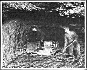 The next step is to shovel the coal from the floor into a mine car, which is then pushed into the adjacent entry. The miner attaches a numbered tag to the car, so that he will be duly credited for his work, which is paid for by the ton. The loaded cars are eventually hoisted or hauled out of the mine, to be weighed and discharged above ground.