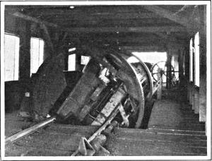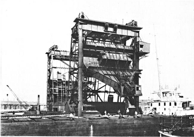 Another ingenious device is the “car-dumper.” This powerful machine picks up bodily from the railway track a car loaded with a hundred tons of coal, overturns it, and discharges its contents into the hold of a vessel; after which it returns the car to the track. It is capable of handling fifty cars an hour. It is equipped with special apparatus to prevent the coal from being discharged too violently, and thus being badly broken up.