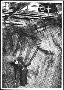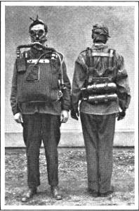 Showing apparatus worn on entering mines after explosions. This device sustains a man for two hours