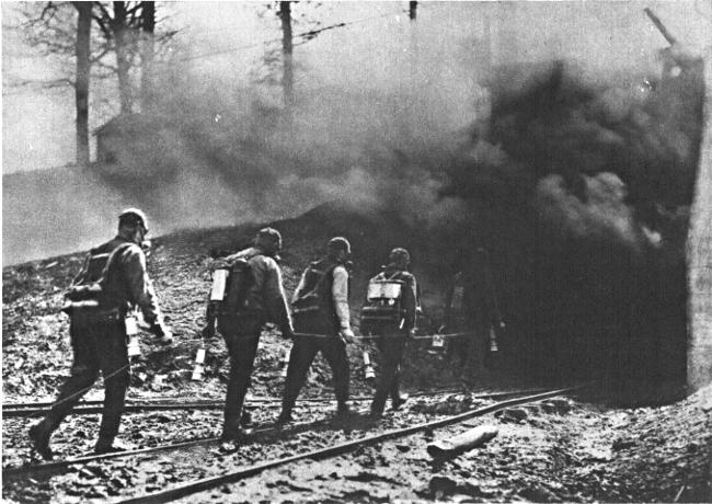 for indications of poisonous coal gas. Reserves testing the air of a mine after an explosion