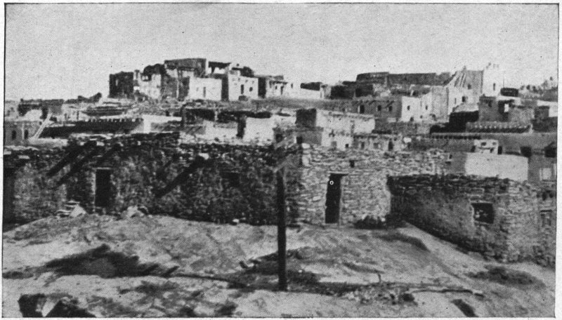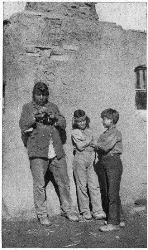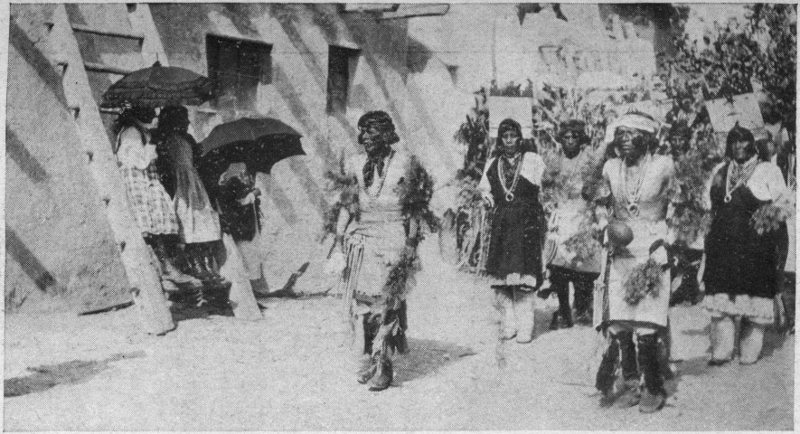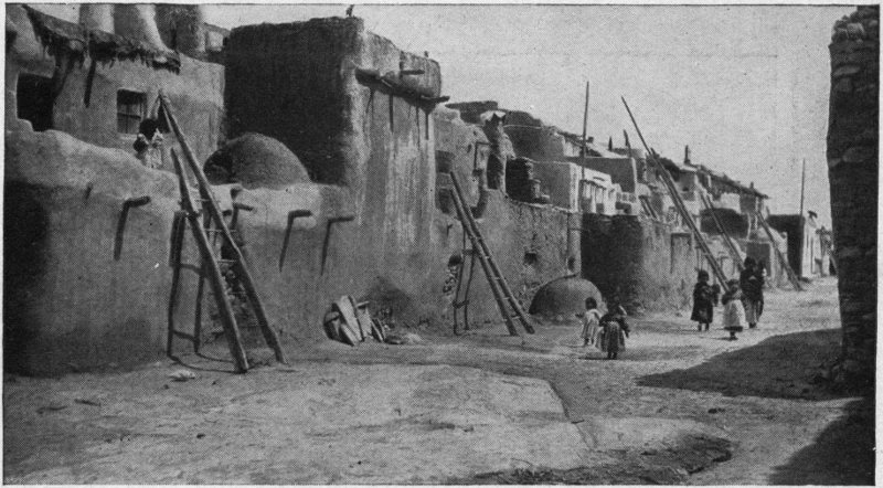 Of course you must make the trip—a half day will suffice for it—from Santa Fe to Tesuque, a village of the Pueblo Indians 9 miles to the north, and you should pronounce it Te-soo´kay. If your knowledge of Indians has been limited to the variety seen in Wild West Shows and historical pictures, you will be surprised at those you find at Tesuque. This is a quaint adobe village around a spacious plaza upon which an ancient, whitewashed Catholic church faces. The houses when of more than one story are built terrace-like, so that the roof of the first story forms a front yard to the second. Ladders lean against the outer walls, by which access is gained to the upper rooms. The 21 population of about 150 live very much like their Mexican neighbors, raising by irrigation crops of corn, beans, peaches, melons, and alfalfa, accepting meanwhile from the liberal hand of Nature rabbits, piñones and wild plums, and pasturing sheep and cattle on the communal pueblo lands which Spain granted them centuries ago and which our Government confirmed to them upon the acquisition of New Mexico. Their method of town building is not borrowed from the whites, but is their own; and because the Spanish Conquistadores of the sixteenth century found the region sprinkled with such permanent villages, called pueblos in Spanish, they named the people Pueblo Indians—a term which well characterizes them in contra-distinction to the nomadic tribes, whose villages moved as the tribe moved.