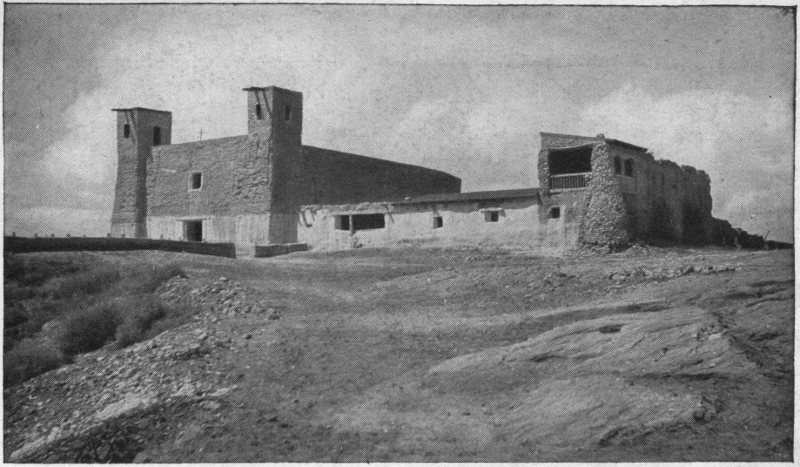 A short block from the Plaza is the Cathedral of San Francisco, whose unfinished trunks of towers are a prominent feature in Santa Fe’s low sky-line. You may or may not get something from a visit to it. It is a modern structure, still incomplete, built upon and about an older church believed to date from 1622. Beneath the altar reposes all that is mortal of two seventeenth century Franciscan missionaries 11 to the New Mexico aborigines. Of one of these, Padre Gerónimo de la Llana, I cannot forbear a word of mention. He was a true brother of Saint Francis, and for many years ministered lovingly to the Indians of the long since ruined pueblo of Quaraí, a place of which more later. At Quaraí he died in 1659, and his body was interred in the old church there whose walls still stand, one of the most striking ruins in New Mexico. To his Indians he was no less than a saint, and when (under attacks from Apaches, doubtless) they abandoned their pueblos about 1670, they bore with them what remained of their dear padre santo to Tajique, a pueblo some 15 miles distant, and buried him there. But in those days Apaches never ceased from raiding, and from Tajique, too, some years later, those Pueblo folk were forced to flee—this time across the rugged Sierra Manzano to Isleta on the Rio Grande. That was a journey of too great hardship, I suppose, to admit of carrying the now crumbled padre with them; so he was left in his unmarked tomb in a savage-harried land, to 12 be quite forgotten until 85 years later (in 1759) pious old Governor F. A. Marin del Valle heard of him. A search was speedily set on foot and after a long quest the bones of Padre Gerónimo were found, brought to Santa Fe, and becomingly once more interred. Then, alas! the poor brother dropped out of mind again until in 1880, when during some work upon the new Cathedral, the discovery of an inscription set in the wall 121 years before by Governor del Valle led to the finding of the grave. I think you will be interested to read the quaint Spanish epitaphs of this fine old friar, and of his companion, too, Padre Asencio de Zárate, sometime of Picurís pueblo. They may be found behind the high altar, which hides them.