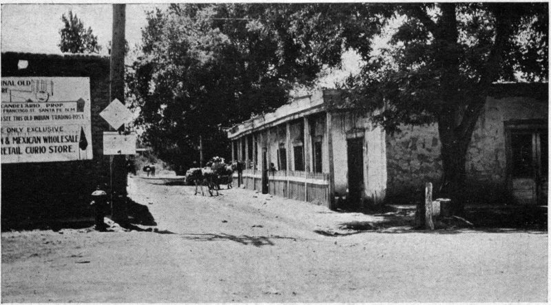 The situation of Santa Fe is captivating, in the midst of a sunny, breeze-swept plain in the lap of the Southern Rockies, at an elevation of 7000 feet above the sea. Through the middle of the city flows the little, tree-bordered Rio de Santa Fé, which issues a couple of miles away from a gorge in the imposing Sierra Sangre de Cristo (the Mountains of the Blood of Christ), whose peaks, often snow-clad, look majestically down in the north from a height of 10,000 to 13,000 feet. The town is reached from Lamy[2] by a branch of the Atchison, Topeka and Santa Fe Railway, which climbs due north for 18 miles through an uninhabitated waste dotted with low-growing piñon, juniper and scrub. At the station a small army of bus, hack and automobile men greet you with enthusiasm, and to reach your hotel you have only the choice of them or your own trotters, for street cars there 6 are none. In Santa Fe, however, no place is far from any other place—the population is but a scant 8500. Of these a large percentage is of Spanish blood, and Spanish speech and Spanish signs engage your attention on every hand.