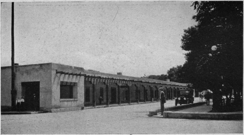 Facing the Plaza on the north is the ancient Palacio Real or Governor’s Palace—a long, one-storied adobe building occupying 9 the length of the block, and faced with the covered walk or portico (they call such a portal in New Mexico) which in former years was a feature of every building of importance in Santa Fe. Within its thick walls for nearly three centuries the governors of New Mexico resided—Spaniards, Pueblo Indians, Spaniards again, Mexicans and finally Americans.[3] In 1909 the building was set aside as the home of the Museum of New Mexico (since removed to a handsome edifice of its own in the New Mexico style of architecture across the street), and of the School of American Research.[4] Some careful restoration work was then done, necessary to remove modern accretions and lay bare certain interesting architectural 10 features incorporated by the original builders, such as the handwrought woodwork, the fireplaces, doorways, etc., so that the edifice as it appears today is outwardly very much as it must have looked a century or two ago. The festoons of dried Indian ears, however, which are said to have been a rather constant adornment of the portal in old times, are now, to the relief of sensitive souls, humanely absent. Within, the Palace is a mine of information for the curious in the history, archaeology and ethnology of our Southwest, and a leisurely visit to it makes a useful preliminary to one’s travels about the State. The building is open to all without charge.