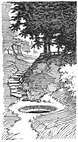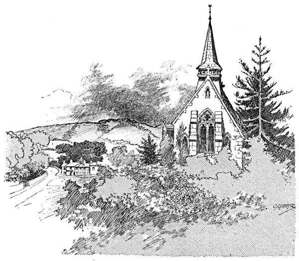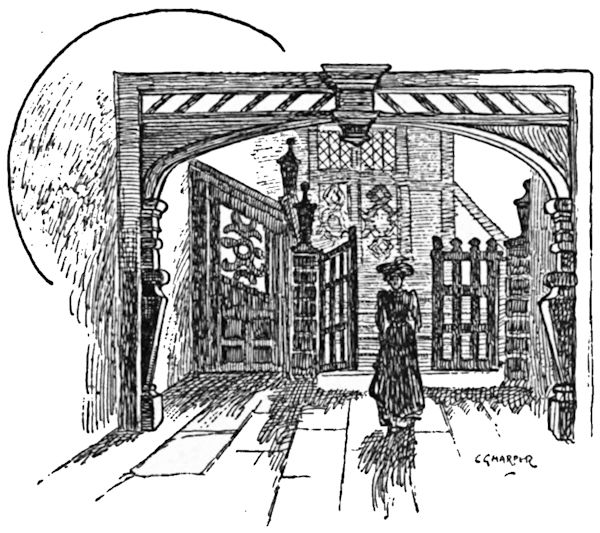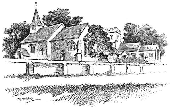 Being quiet tourists, we leave the Great North Road and its crowds of cyclists without a regret, and, turning to the right by the “White Hart,” come immediately along pleasant byways beside the Mimram. Here we pass under the great viaduct that for some time past has been blotting out the surrounding landscape, and providentially lose sight of it altogether. Crossing the stream just beyond, the park of Tewin Water is skirted, and a left-hand turning in the lane where the park ends brings us across the stream once more, and so to Tewin village, if one can call that a village whose chief characteristic is a plentiful lack of houses. There are legends at Tewin. In a meadow by the church may yet be seen the foundations of old Tewin House, demolished many years ago; and here, it is said, lived that old Lady Cathcart who was four times married, and four times left a widow. The first she wed to please her parents, the second for money, the third because of his title, and the fourth was put in her way “because the devil owed her a grudge and wanted to punish her for her sins.” This last venture of hers was disastrous, and probably prevented her attempting a fifth. It was in 1745 that she married Number Four—a Colonel Hugh Maguire, who took her to Ireland and kept her shut up for nearly twenty years; until, in fact, his death released her. Perhaps he had seen the posy ring she wore, which bore the pleasing sentiment—