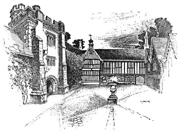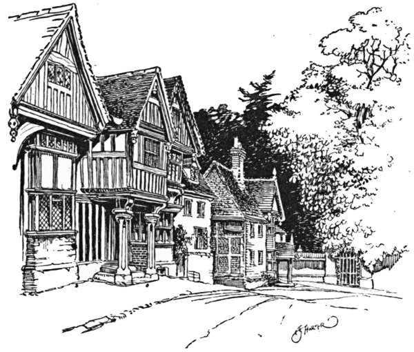 New Chapel, a hamlet beyond Blindley Heath, is succeeded in four miles by the imposing old town of East Grinstead, a stone-built town of Tudor architecture where assizes were formerly held. Interest is divided between the old “judge’s lodgings,” the noble quadrangular group of almshouses known as “Sackville College,” founded in 1609 by the then Earl of Dorset, and that ancient hostelry, the “Dorset Arms,” over whose doorway there has for some years past appeared a quotation from the present Poet Laureate’s “Fortunatus the Pessimist,” placed there by some landlord more appreciative of the poetry of Mr. Alfred Austin than is commonly the case. It reads—