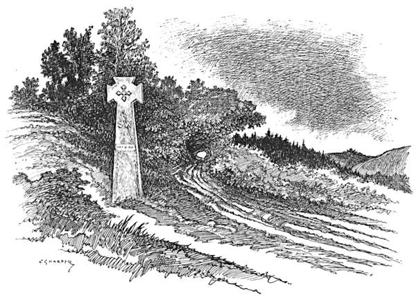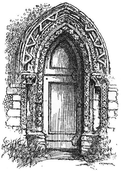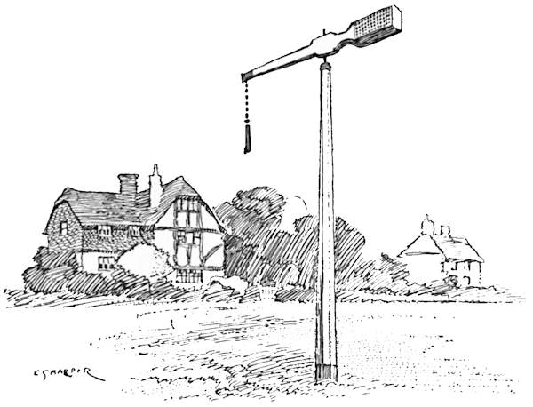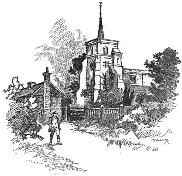 Following the road indicated by the sign-post that stands prominently near the Oak, we make for Northaw,[236] whose name means “Northwood.” The most exhilarating of coasts down through woodlands, with wide views, blue and beautiful, of woods and parks, leads to a cottage or two marked “Cuffleys” on the Ordnance map. Turn to the left here, and so, by a country lane, to the small village of Northaw, with a modern church standing on its pretty green. Thence it is as straight ahead as the winding but splendidly surfaced road will allow, to Potter’s Bar. Here the Great North Road is reached. Continue through the somewhat characterless village and turn off to the right where a sign-post points to Potter’s Bar Station and South Mimms, along what is called Mutton Lane. At a quarter of a mile from South Mimms turn to the left, and the old church tower presently comes in sight. Here we find the Holyhead road running right and left. Turn to the right, and then to the left off the highway, and up the rising gradient of the village street. At once the most concise and most readily understood direction to Shenley is this: “Follow the telegraph poles.”