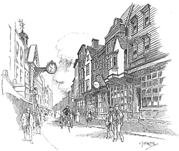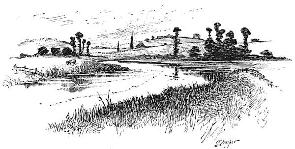 goes in the prettiest of perspectives across the fields, making, with the wayside alders, the old-fashioned canal-locks, and the many water-channels that everywhere abound, pictures for sketcher or photographer. As for colour, notice that remarkably old-world square of bowed and bent, nodding and decrepit houses called the “Cattle Market.” Rarely, indeed, does the painter find so exquisite a tone as that of these ancient red brick buildings.