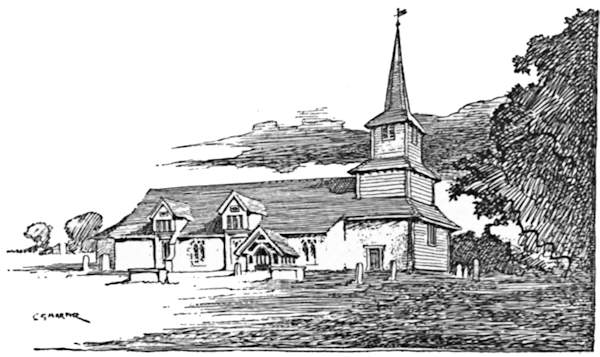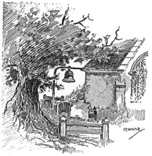 Shenley Church lies a mile away from the village and has lost its tower. The bells, save one, were removed to the more accessible Chapel-of-Ease in the village, and the one remains in the churchyard, hung in the most extraordinary manner on an iron bar.