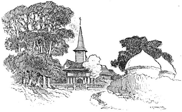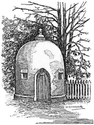In under three miles this village is gained—one of the quaintest and most old-world of places, with an[237] old “round-house,” or village lock-up, standing between a horse-pond and the “Queen Adelaide Inn.” Local gossip tells how the last of the long line of petty offenders to be imprisoned here was the then landlord of that inn twenty-three years ago. He had, innocently enough, taken home for firewood a few pieces of wood he had found in a neighbouring park. So they locked him up, and the reeking dampness from the pond nearly killed him.