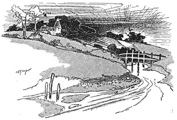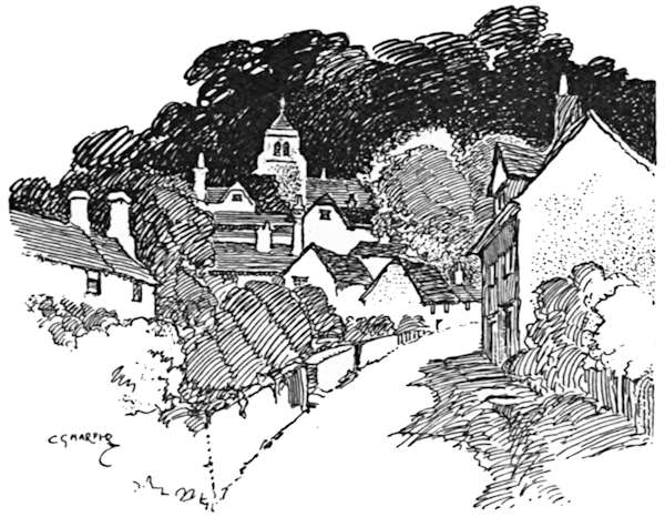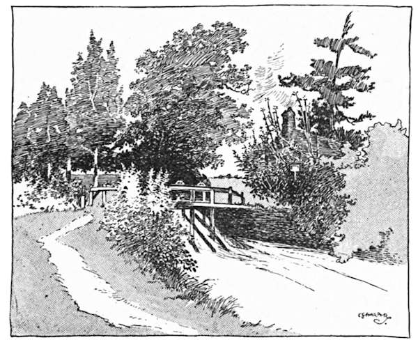 But if Hemel Hempstead be not particularly inviting to the cyclist, at least the road that runs thence to Great[242] Gaddesden has supreme charms. Hitherto we have been on high roads; here we are on byways bordered by parks and picturesque hamlets. It is but two miles from the town we have just left, through Piccott’s End and Water End, to Great Gaddesden. At the beginning of Water End there is an exquisitely beautiful bit that Corot himself would have loved to paint; where a group of tall, bushy Lombardy poplars hangs over the old bridge that carries the road over the river Gade, and[243] gives a lovely foreground to a view of an ancient two-gabled, white-faced farmstead amid fertile water-meadows. To lead one’s cycle on to the grass beside the water and to lie here in the sunshine of a hot summer’s afternoon, lulled by the rippling of the stream and the purring of the wind among the poplars, is a delight.