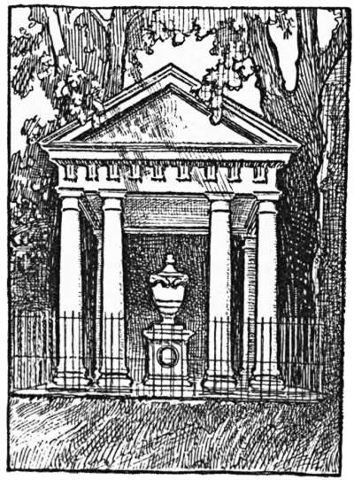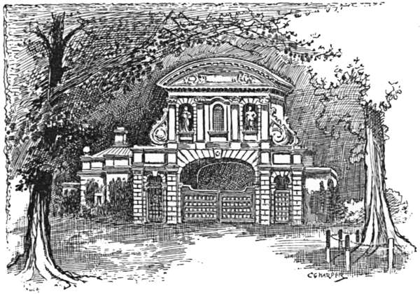 The story of Wren’s beautiful, but inconvenient, entrance to the City of London is a romantic one. Long used as a Golgotha on whose topmost cornice to display the heads of decapitated traitors, it remained at the Fleet Street entrance to London until the increasing traffic necessitated its removal in 1877. The stones were all numbered and stored away in the City stone-yard for some eight years, and meanwhile the City authorities offered them as a gift to several persons or public bodies, without finding anyone to accept the gift. The Benchers of the Temple, who had the opportunity of securing the relic for one of their quiet courts, incredible though it may seem, refused it; but at last the old Bar was accepted by Sir Henry Meux, and re-erected here as an entrance lodge. It is the old familiar Temple Bar, cleaner than of yore, and more easily studied in this quiet spot than of old, in the roaring traffic of Fleet Street; but that it should thus be banished from its native London and be in private ownership seems pitiful. Why not, in these days when it has been proposed to restore the Elgin marbles to Athens—why not agitate for its restitution and re-erection in some quiet City lane?